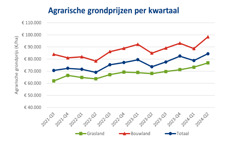 In het eerste kwartaal van dit jaar zakten de gemiddelde grondprijzen in ons land nog wat terug, maar in de afgelopen drie maanden heeft een krachtig herstel plaatsgevonden. Voor de tweede keer ligt het landelijk gemiddelde boven de grens van €80.000 per hectare.