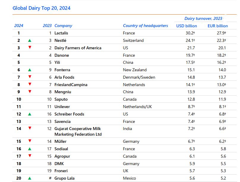 De sterkste stijger op de lijst is dit jaar het Amerikaanse Schreiber Foods, dat steeg van plaats 16 naar 12. Het Ierse Glanbia viel uit de top 20 nadat het uit een kaas joint venture met Leprino stapte. In plaats daarvan maakt de Mexicaanse Grupo Lala haar entree, mede dankzij een sterke Mexicaanse peso.