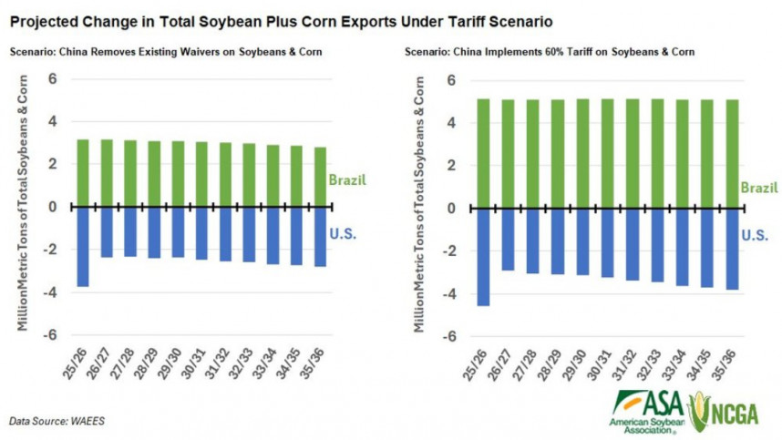 De ASA en NCGA hebben doorgerekend wat het zou betekenen als China als tegenreactie op een Amerikaanse importheffing met een heffing van 60% op Amerikaanse maïs en soja komt. Ten opzichte van de huidige situatie zou de export van soja vanuit de VS naar China met ruim 50% terug kunnen lopen en zou er tot bijna 90% minder maïs geëxporteerd worden. Dat blijft niet zonder gevolgen voor de prijzen van deze gewassen in de VS. Voor soja verwachten de belangenorganisaties een daling van $1 per bushel (soja staat nu rond de $10 per bushel). Dat is een flinke klap voor de Amerikaanse boeren die de laatste twee jaar de grootste daling van inkomen doormaken sinds de jaren zeventig. De plattelandseconomie loopt alleen al door een heffing op maïs en soja ruim $7 miljard per jaar mis volgens de organisaties.