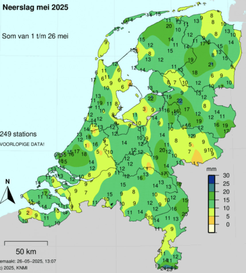 Klaasjan Boer uit Kortgene (Zeeland) kan zijn uien niet beregenen, maar is toch tevreden over hoe ze erbij staan. Sinds het zaaien is er in totaal zo'n 30 mm regen gevallen, inclusief een buitje van 11 mm afgelopen weekend. "Dat was een mooi buitje, maar het waait er ook zo weer uit," zegt hij. Ondanks de beperkte neerslag zijn er verrassend goede planten te vinden. "Sommige uien hebben nog maar één pijpje, terwijl andere er al vier of vijf hebben. Het is enorm wisselend."