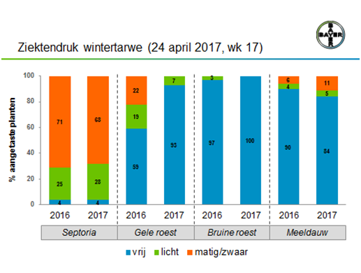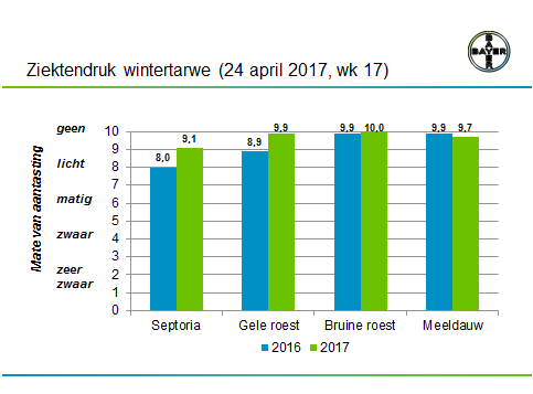 Fig. 1: Bayer Ziektenmonitoring Wintertarwe. Gemiddelde ziektendruk in week 17, 2017 t.o.v. 2016.