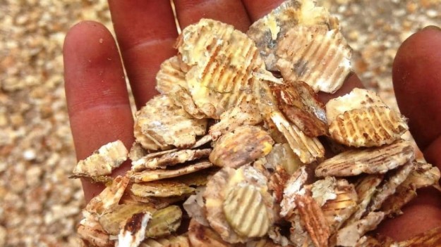 De veldbonen zijn direct na de oogst geplet. Dit is een pens bestendiger voer dan gemalen bonen.