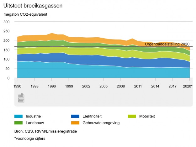 De reductie ten opzichte van 1990 is volgens de voorlopige raming 24,5%. Dat komt is in de buurt van de Urgenda-doelstelling van 25% reductie over de periode 1990 tot en met 2020. Ook de uitstoot van broeikasgassen in de landbouw daalde afgelopen jaar licht. Het grootste deel van CO2 emissie in deze sector komt voor rekening van aardgas dat gebruikt wordt warmtekrachtinstallaties. Daarmee wordt elektriciteit en warmte geproduceerd. De CO2 word als (deels) als bemesting in de kassen gebruikt. De meest broeikasgasuitstoot is in de landbouw echter geen CO2 maar andere gassen zoals methaan en lachgas.