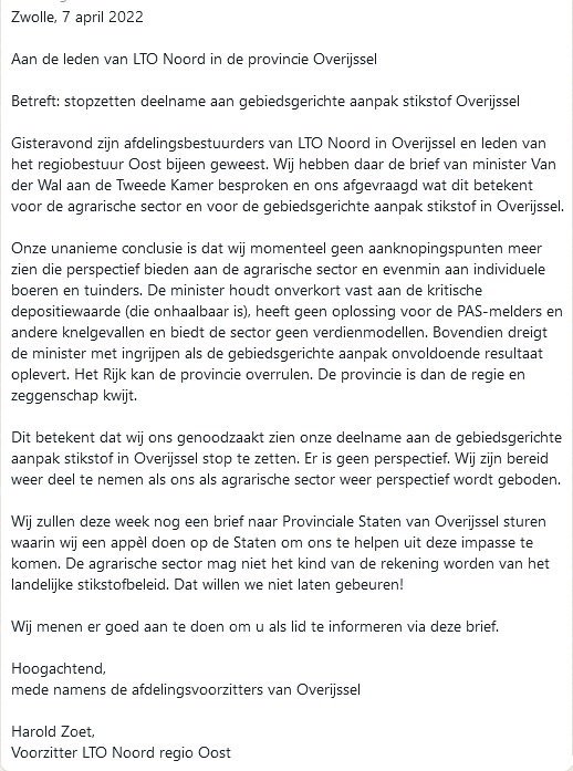 Zoet stelt in de brief aan de leden dat er later deze week een brief naar Provinciale Staten van Overijssel zal worden gestuurd om het standpunt toe te lichten, maar met de huidige brief zijn de leden alvast op de hoogte stelt.