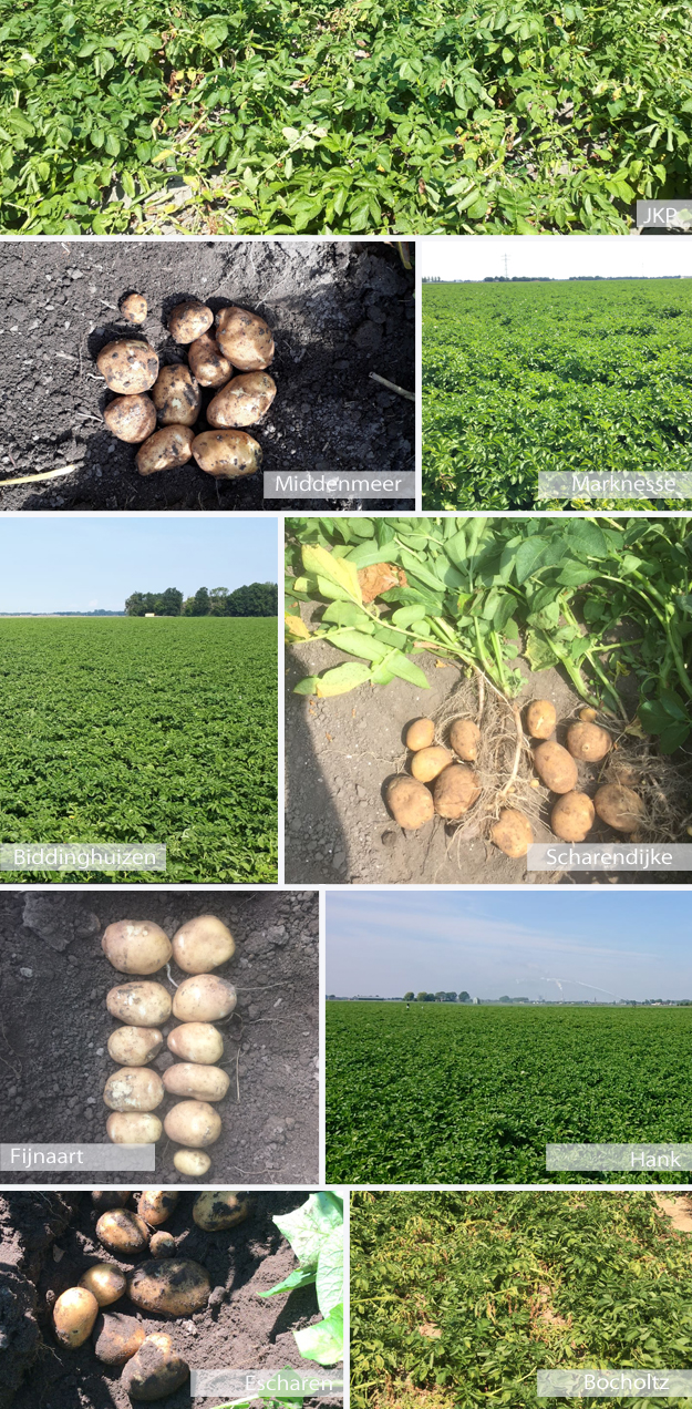 Op het perceel in Scharendijke groeit het gewas niet meer. Het onderste blad van de plant wordt geel en valt eraf. De planten op dit perceel hebben de knollen afgestoten. Daar waar er eerst gemiddeld 8 knollen per plant werden geteld, zijn dit er nu nog maar 6.