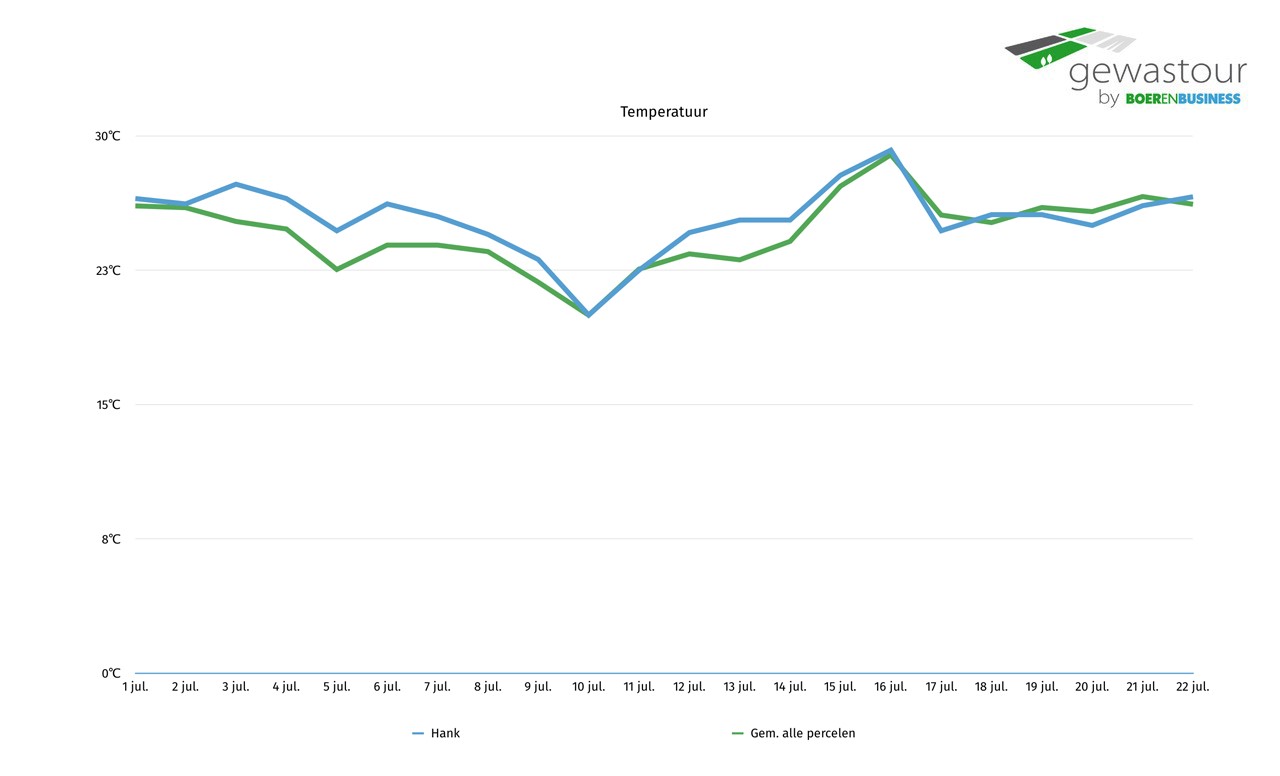 In de maand juli komt de gemiddelde temperatuur op het perceel in Hank uit op 19,5 graden Celsius, ruim 2,5 graden warmer dan het koelste perceel dat meedoet aan de Gewastour (Spijk). De percelen in Fijnaart (19,67 graden Celsius) en Bocholtz (19,84 graden Celsius) zijn gemiddeld iets warmer.