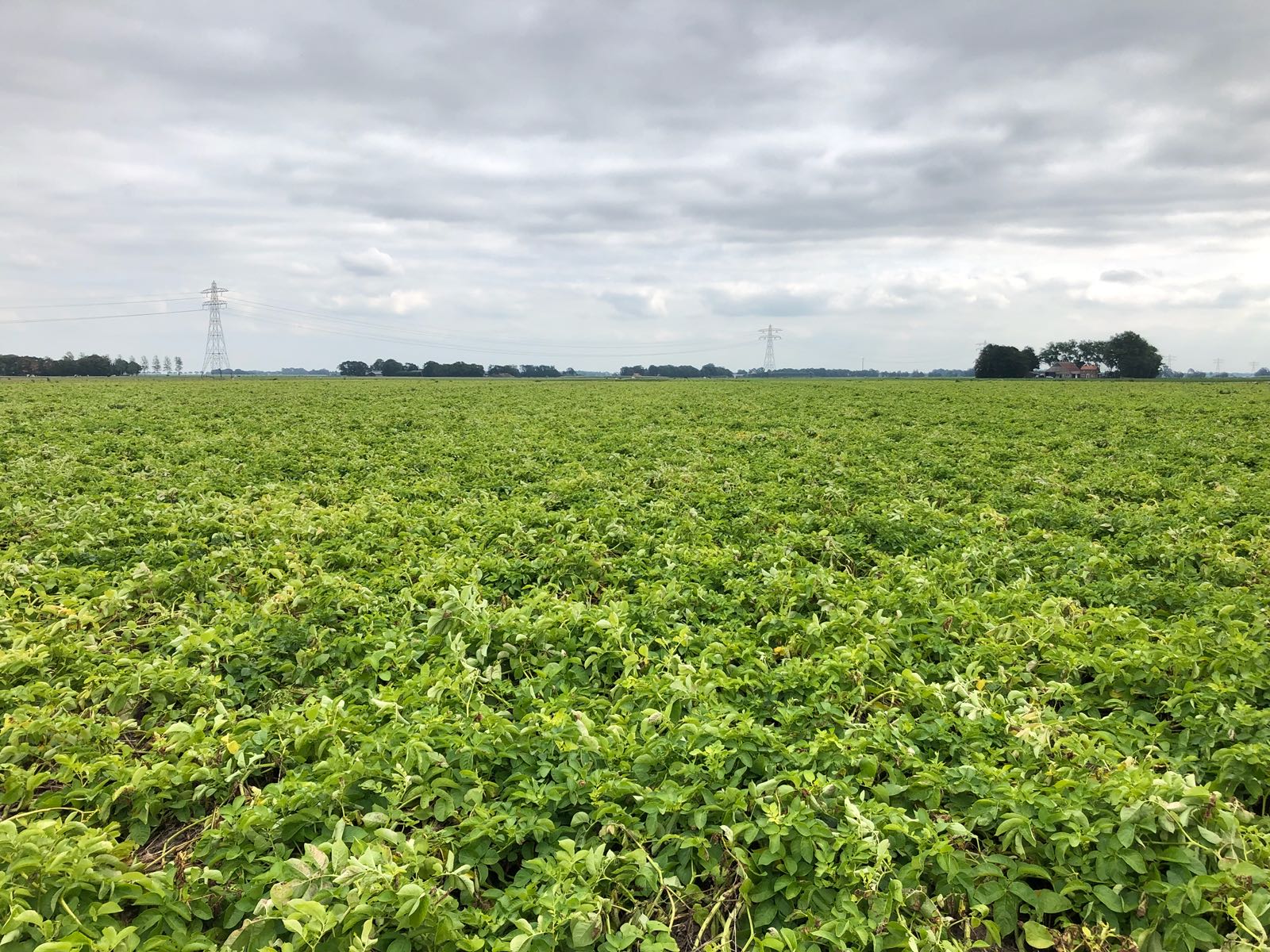 Op het aardappelperceel in Marknesse is het loof ingezakt en sterft het op een gezonde manier. Het verschil in de structuur is dit jaar erg goed zichtbaar. Op de plekken waar de grond minder opdrachtig is, staan de aardappelen beduidend minder.