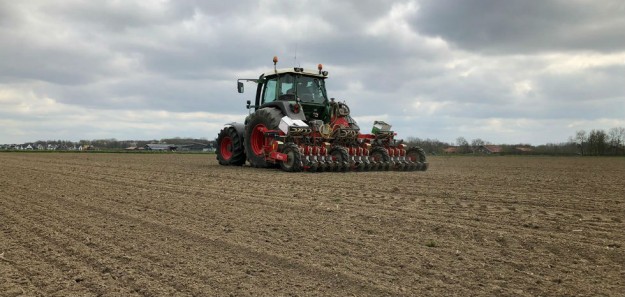 Op het perceel van Aeres Farms in Dronten is vrijdag 5 april gezaaid. Het zaaibed is afgelegd met een sneleg en er zijn 3,8 eenheden gezaaid op bedden van 1,5 meter. De geplante uien zijn van het ras 'Hyway', wat een middenvroeg ras is.