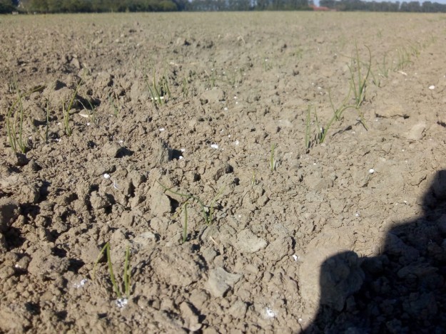 Op het uienperceel in Kortgene is ook sprake van tweewassigheid. Op de foto is zichtbaar hoe een gedeelte van de uienplantjes 2 pijpjes telt, waar een ander gedeelte net door het stadium 'vlagblad' komt.