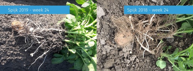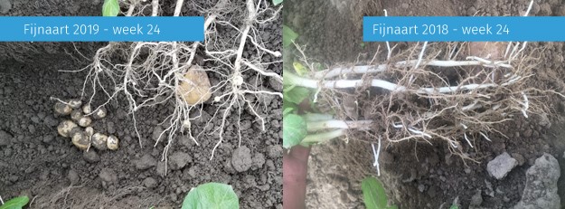 Op het aardappelperceel in Middenmeer (Noord-Holland) lijkt het op dit moment vanzelf te gaan. De groei zit er duidelijk goed in, want in 6 dagen tijd is het perceel gesloten in de rij. De knolzetting gaat nagenoeg gelijk op met vorig jaar. Daarentegen wordt op het aardappelperceel in Fijnaart (Noord-Brabant) duidelijk dat de knolzetting verder ontwikkeld is dan in 2018.