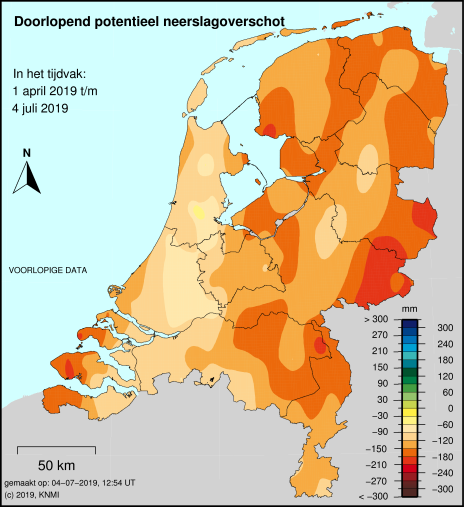 Het landelijke neerslagtekort ligt op 119 millimeter. De komende 2 weken zal dit gemiddelde naar verwachting oplopen naar 146 millimeter. Dat is iets hoger dan normaal, maar vooralsnog gunstiger dan in het afgelopen jaar. Uitzonderingen zijn de Achterhoek en Twente, waar de situatie op het moment kwetsbaar is voor de landbouw en natuur.