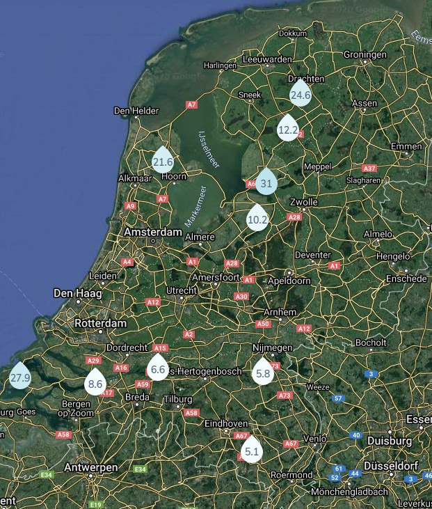 In Ens is de meeste neerslag gevallen, het perceel in Someren kreeg de minste neerslag met 3.6 millimeter. Noord-Brabant heeft de minste neerslag gekregen en globaal gezien heeft het noorden meer regen gehad dan het zuiden, met uitzondering van Scharendijke.