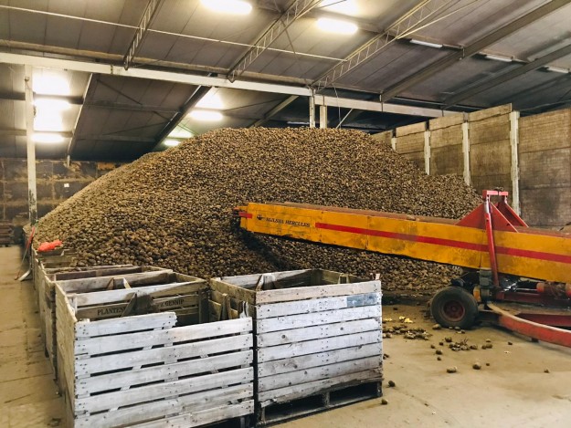 Dat laatste is in Dronten (Flevoland) wel aan de orde, want daar wordt op het moment nog gerooid. "Het is een kwestie van goed de weerberichten in de gaten houden. Gelukkig zitten wij niet op heel zware klei, waardoor we tussen de buien door nog kunnen rooien. Ik verwacht dat het perceel met een halve dag wel leeg is." De opbrengst lijkt goed te zijn. "Als ik kijk naar de inhoud van de kieper en cel, dan verwacht ik een opbrengst die wellicht zelfs boven het resultaat van de proefrooiing uitkomt (bijna 63 ton)."