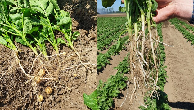 Visueel gezien waren de verschillen boven de rug minimaal, of deze nou begin april of halverwege april gepoot is. Als we in de aardappelruggen kijken, is het beeld heel anders. Het perceel van Herman Schlepers in Dronten is eind maart gepoot en daar zijn de eerste knollen duidelijk zichtbaar. Het vormen van stolonen is al enige tijd begonnen en de knollen zijn vol aan het groeien. Op het andere Gewastourperceel is nog geen knolvorming. Meerdere aardappeltelers zien dit beeld bij de vroeg gepote aardappelen. Boven op de rug lijkt de plant misschien hetzelfde, maar in de aardappelrug is het beeld dus heel anders.