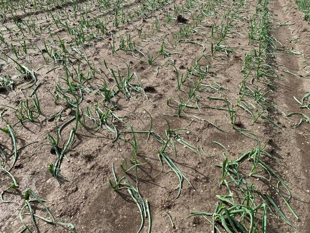 In de Noordoostpolder ging het er hard aan toe. Windstoten en hagel hebben daarbij percelen flink toegetakeld. Op het Gewastourperceel in Nagele (Noordoostpolder) is dat goed terug te zien. De zaaiuien hebben door de wind een flinke klap gekregen. Sommige planten zijn zelfs afgesnoerd, anderen zijn geknakt. Het is de vraag hoe deze zich herstellen.