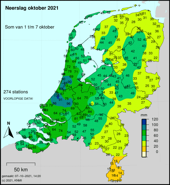 Oktober lijkt tot op heden weer meer op het wisselvallige weer van afgelopen zomer te lijken. Sommige aardappeltelers hebben het aardappelrooien moet uitstellen vanwege de droogte, maar moeten dat nu helaas weer doen vanwege de natte. Vooral het westen ontving veel millimeters, maar ook in het midden van Nederland staan de rooimachines stil. Kees Vrolijk, aardappelteler in Fijnaart (Noord-Brabant), ontving deze week maar liefst 77 millimeter, een maandsom aan neerslag. Ook het perceel in Hank (Noord-Brabant) staat nu op 70 millimeter.