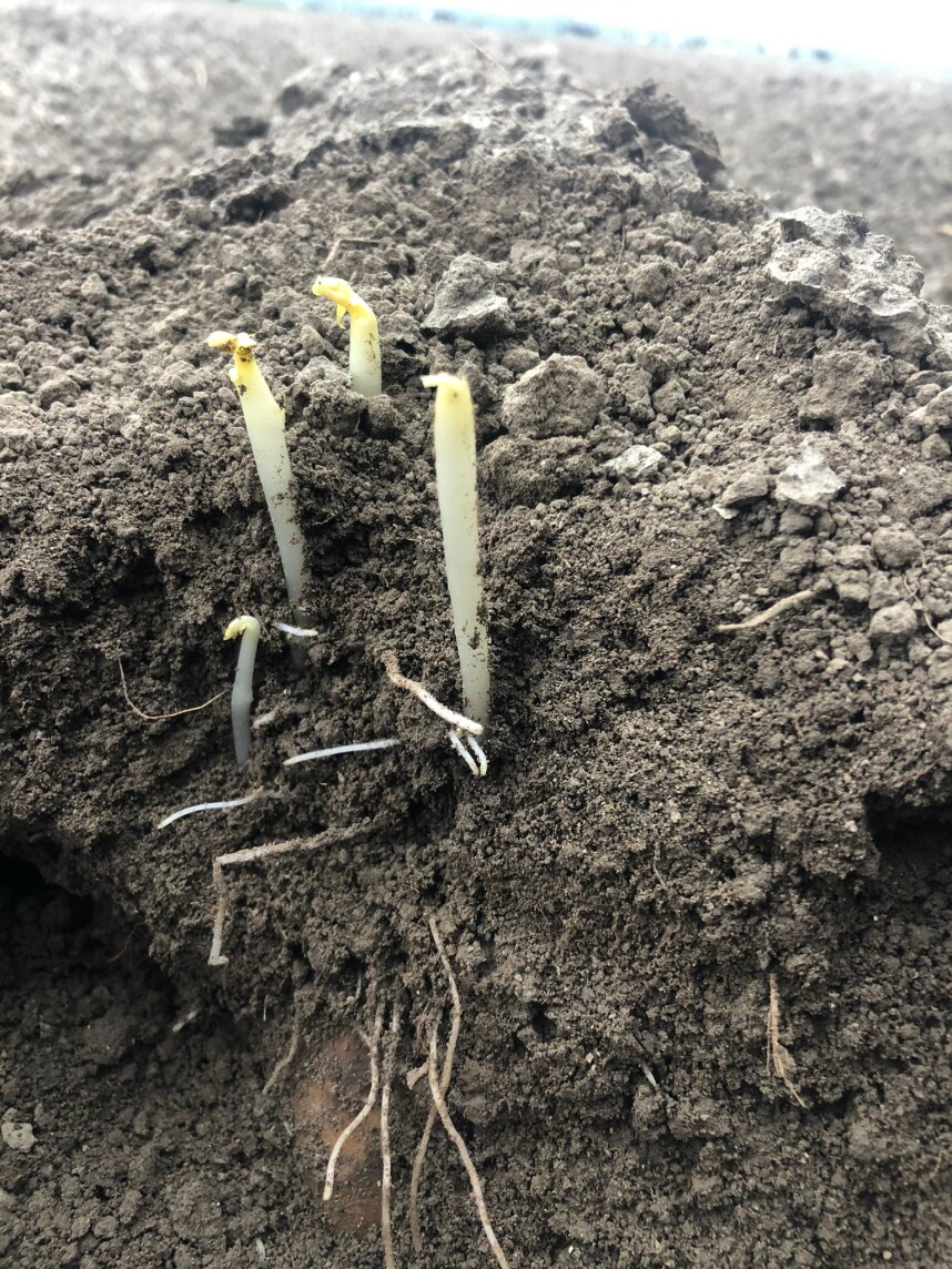 De eerst gepote aardappelen in Dronten (Flevoland) komen nagenoeg boven. Op 24 maart werden deze gepoot en dus zijn ze ruim een maand onderweg. Het aanfrezen van deze ruggen is ook deze week gebeurd, net voordat ze boven stonden.