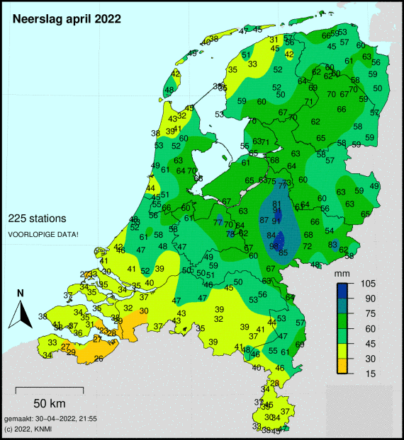 Na een zonovergoten en droge maand maart begon april met behoorlijke (sneeuw)buien en viel er in de meeste regio's een behoorlijk aantal millimeters. Telers op zavel en klei die pas hadden gezaaid, zagen verbitterd aan hoe een korst de opkomst belemmerde. Andere telers omarmden de regenbuien juist, zoals in het zuiden. Opvallend voor deze maand is dat de neerslag alleen in de eerste week van april viel en het sindsdien - op wat gesputter na - compleet droog is gebleven.