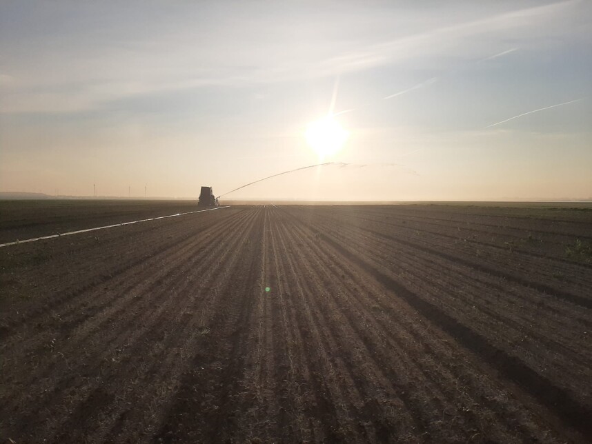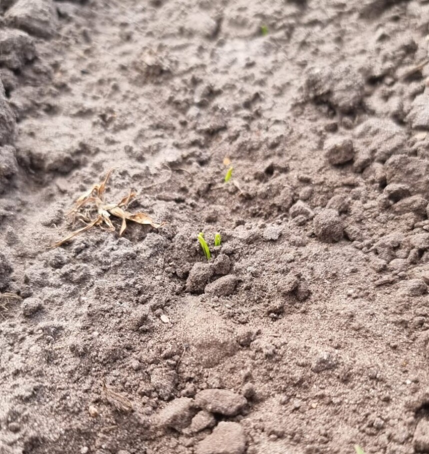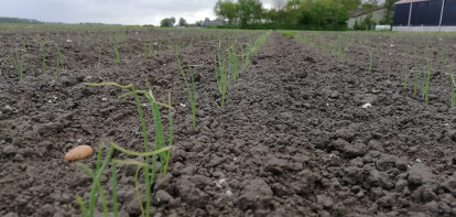 In Wezup (Dr) bij Arjen Jakobs komen de uien net boven en heeft de rest al een groen kiempje. Hij heeft vlak na de zaai het perceel al beregend en is van plan komende week de haspel er opnieuw bij te halen: "Beregenenis nodig zodat er een harder laagje bovenop ontstaat. Die zorgt dat het daaronder minder snel uitdroogt. Ik denk dat het met een volgende beregening goed moet lukken".