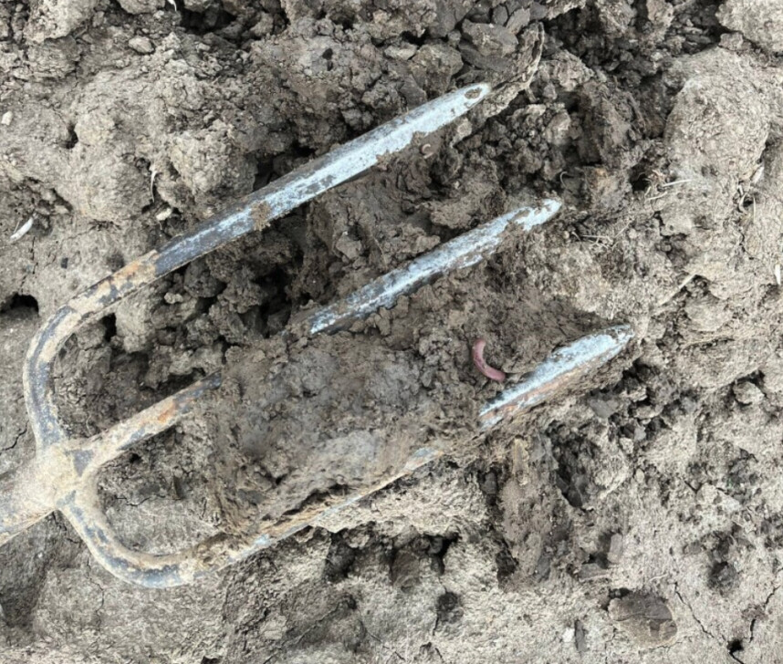 Wim de Witte uit Steenbergen (NB) is wezen kijken hoe de grond was om aardappelen te poten, maar vond de grond nog niet geschikt om te poten. Van boven lijkt het droog vanwege de grijze kleur, maar daaronder is het erg nat. Door de temperatuur en de wind droogt de grond wel hard op.