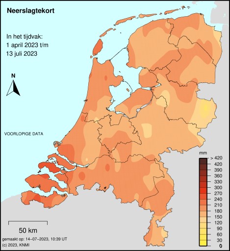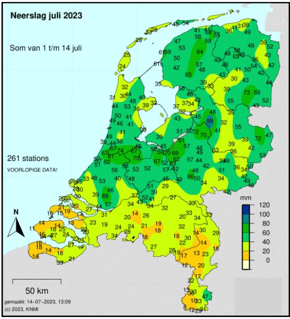 Neerslagkaart 1 t/m 14 juli Bron: KNMI