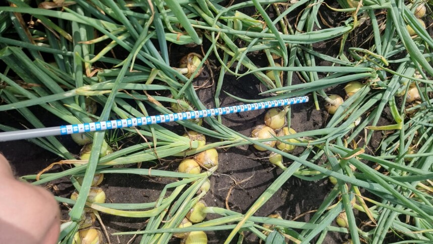De Wit heeft afgelopen weekend een proefrooiing in zijn uien gedaan. "Met de proefrooiing is 1,5 vierkante meter uien gerooid. Ik kwam op 8,8 kg vers gewicht van 135 uien. Omgerekend naar tonnen per hectare is dat bruto ruim 58 ton. Ongeveer 17% van de uien zijn nu 60% op. Er zit nog potentie in het perceel om door te groeien", oordeelt De Wit.