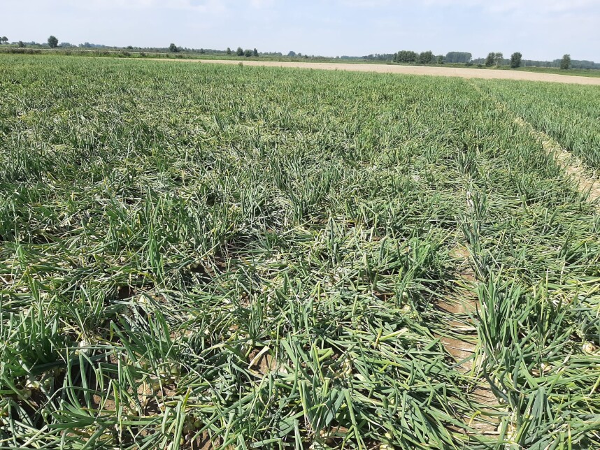 In Wezup (Dr) is een gedeelte van het perceel gaan strijken. "Het perceel is niet egaal qua grond. Daardoor zit er een verschil in de plekken waar de uien strijken op het perceel", zegt Arjen Jacobs. "Ik heb gedurende het seizoen bladmeststoffen mee gespoten om het gewas vitaler te houden. Ik hoop dat het gewas daar nu ook nog van kan profiteren. Zoals het gewas er nu uit ziet duurt het nog vier weken voordat ik de uien kan rooien. Ze voorspellen komend weekend hoge temperaturen, dus ik weet niet hoe hard het gewas dan gaat slijten."