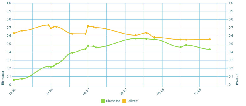 In Fieldscout van het dataprogramma Bioscope worden de gewastourpercelen vanuit de lucht gevolgd, waarbij onder andere de groei en biomassa van het perceel wekelijks zichtbaar zijn. Daarin wordt het slijten van Innovator bevestigd in de afname van de biomassa. De gegevens van het Gewastourperceel in Hellevoetsluis geven dit beeld goed weer. Ook is te zien dat de neerslag ervoor heeft gezorgd dat het gewas weer wat groeide in biomassa op 14 augustus tot een index van 0,49. In totaal daalde de biomassa-index van 0,56 op 30 juli naar 0,43 op 23 augustus met een kleine groei door neerslag op 14 augustus.