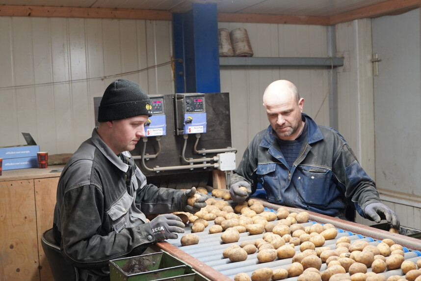 Het is half februari. Na een reeks van grijze dagen klaart de lucht eindelijk weer eens wat op. Voor Gert en Jelmer Boomsma is het nog geen reden om de roldeuren open te gooien. Ze zijn nog te druk met sorteren. "Dit zijn Arizona's. Die gaan binnenkort naar Turkije. Daarna hebben we nog twee partijen Fontane's voor de boeg. We zitten de komende dagen dus nog wel even binnen", zegt Gert terwijl hij de leesband stilzet en een kop koffie aanbiedt.