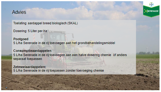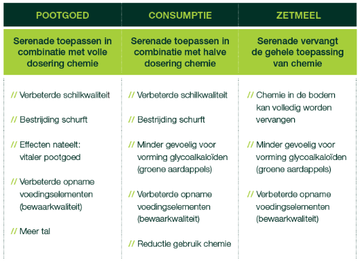 Met het gebruik van Serenade in de teelt van aardappelen, als veurbehandeling, zijn afgelopen seizoen weer mooie resultaten behaald. Een bevestiging van de voorgaande jaren met een duidelijk verbeterde schilkwaliteit. Mede door de mooie bestrijdingsresultaten op zilverschurft, zwarte spikkel en rhizoctonia.