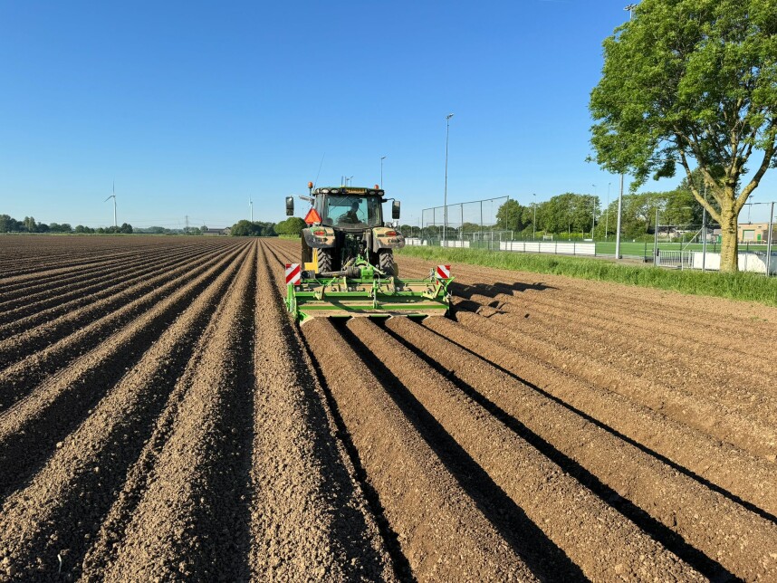 In het Gelderse Elst pootte aardappelteler Daan Tap anderhalf week geleden zijn Gewastourperceel en inmiddels zitten alle aardappelen er bij hem al in. Nu is hij aan het aanfrezen, waarbij het hard drogende weer ook goed zichtbaar is. "We hebben alle aardappelen er in, dus zijn begonnen met de ruggenfrees op onze grond. Het frezen loopt op zich wel mooi, maar bovenop is de grond eigenlijk alweer te droog. De vochtige grond onderin smeert juist nog wat".