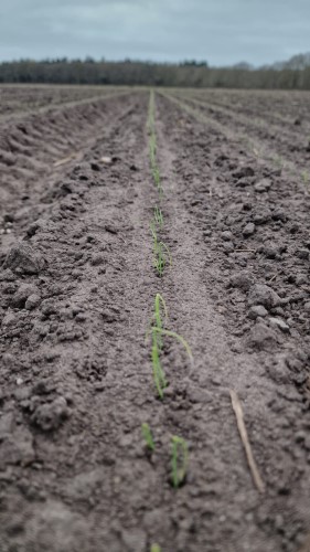 We zijn nog niet eens halverwege april, en nu al zijn op een deel van de percelen de rijtjes uien al goed zichtbaar. De percelen die later gezaaid zijn, hebben de groei ook te pakken. Ook het verschil tussen geprimed en ongeprimed uienzaad is goed zichtbaar, waarbij in hetzelfde tijdsbestek het geprimede uienzaad al een stuk verder ontwikkeld is.