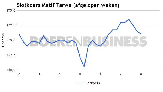 Toch leiden de omstandigheden niet meteen tot grote bezorgdheid. Het zit er daarom dik in dat de termijnmarkt in Parijs maandag daarom verder zakte tot een slot van 171 euro per ton. Dinsdagochtend kleuren de borden weer groen; Actuele stand om 12 uur is 171,25 euro.
