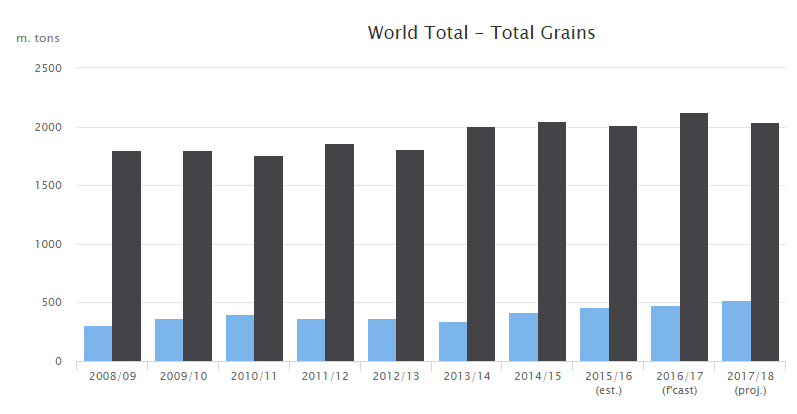 De International Grains Council (IGC) heeft hun prognose voor tarwe ook naar boven bijgesteld. Vooral omdat vanuit het Zwarte Zeegebied een hoge opbrengst wordt verwacht. Na afgelopen seizoen waren de eindvoorraden al relatief hoog. Dit niveau neemt gedurende seizoen 2017-2018 verder toe. De IGC becijfert dat deze met 7 miljoen ton tarwe toeneemt, tot 248 miljoen ton in totaal. Een plus van 4 miljoen ton ten opzichte van de eindvoorraad vorig seizoen.