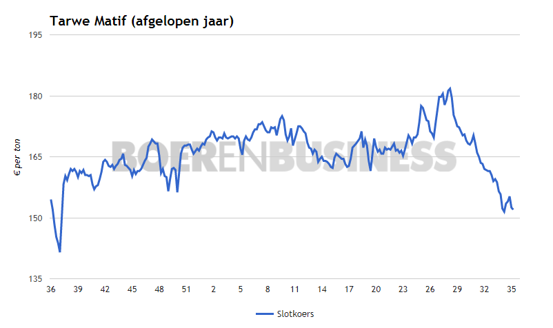 Ook in week 35 staat de granenmarkt wereldwijd onder druk. In Parijs daalde het septembercontract voor maaltarwe tot €152 per ton op dinsdag 29 augustus. De berichtgeving over opbrengstverwachtingen in de verschillende graantelende naties maken het de koers niet gemakkelijk om vaste grond onder de voeten te vinden.