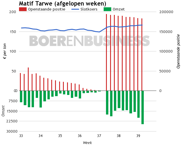 Dinsdag 26 september sloot de termijnmarkt op €166,50. De omzet aan de start van week 39 is hoog. Maandag werden ruim 20.000 contracten verhandeld en dinsdag bijna 25.000. De hoogste omzet sinds half juli.