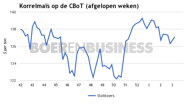 De koers van korrelmaïs beweegt zich binnen een bandbreedte van $136 en $139 per ton.Dit artikel maakt deel uit van het Granen & Grondstof, Melk & Voer en Varkens & Voer abonnement. Insiders hebben exclusief toegang tot de Database met actuele en historische marktcijfers.