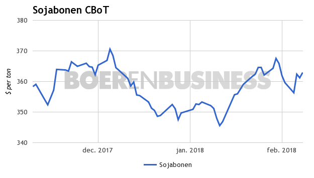 Op de beurs in Chicago (CBoT) was weinig verandering in de prijs van sojabonen te zien. Na een kleine daling op woensdag 7 februari steeg de prijs vrijdag 9 februari weer naar €362 per ton.