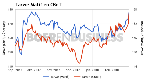 De tarweprijzen op de Matif en CBoT vertonen een sterke stijging.