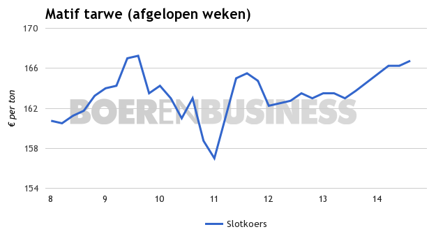 De Matif in Parijs lift mee met de ontwikkelingen op de Amerikaanse beurzen en sloot donderdag 5 april op €166,75 per ton (notering voor mei). Het is een stijging van €3,75, ten opzichte van de week ervoor. De minder goede granenexport vanuit Europa kreeg een opsteker, omdat Algerije en Egypte forse hoeveelheden maaltarwe kochten.