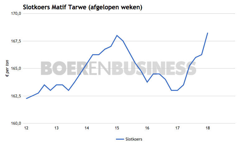 De Matif in Parijs sloot eind april op een koers van €168,25 voor tarwe. Dinsdag 1 mei was geen handelsdag, maar woensdag 2 mei handelt het contract wederom in de plus (€170 per ton). De CBoT was op 1 mei wel open. Daar kreeg het meicontract er $6,34 bij en sloot het op $194,65 per ton, een dergelijk niveau werd voor het laatst op 11 juli 2017 behaald. De laatste handelsdag voor het contract is 14 mei. Ook contracten voor de nieuwe oogst staan in de plus.