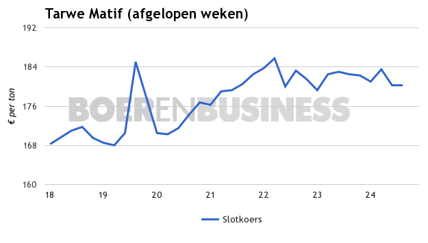 De tarwenotering op de Matif in Parijs beweegt rond de €180 per ton.