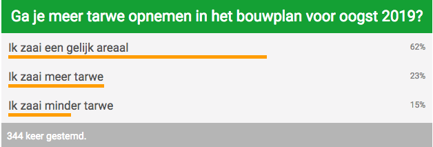 Daarnaast geeft 23% van de 344 respondenten aan juist meer tarwe te gaan zaaien. De overige 15% van de respondenten laat weten dat zij voor oogst 2019 juist minder tarwe gaan zaaien.