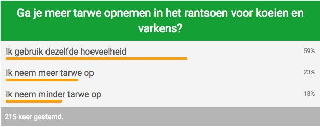 Daarnaast laat 23% van de respondenten weten meer tarwe op te nemen in het rantsoen en laat 18% van de 215 respondenten weten dat er minder tarwe wordt opgenomen in het rantsoen voor koeien en varkens.