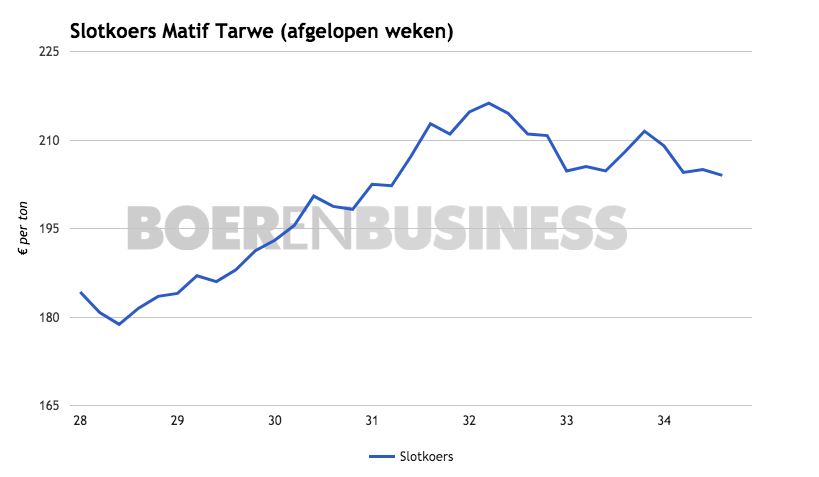 De termijnmarkt voor maaltarwe op de Matif in Parijs daalde €4 tot €204 per ton voor levering september 2018. De notering voor levering december 2018 daalde tot €205,75 per ton, wat een daling van €6,25 betekent. De maïstermijnnotering voor levering november 2018 daalde met €4,25 tot €184,25 per ton, terwijl de notering voor levering januari 2019 met €5 daalde tot €186,50 per ton.