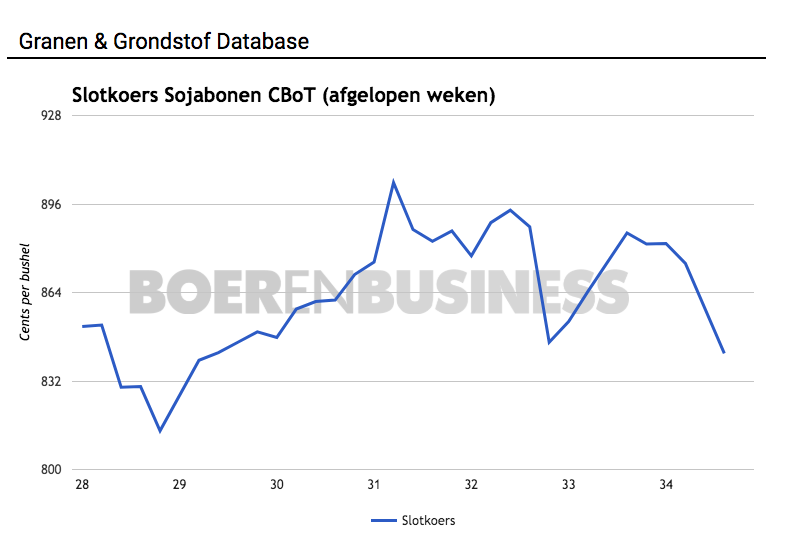 De notering voor sojabonen op de CBoT in Chicago laat een stevige daling zien.