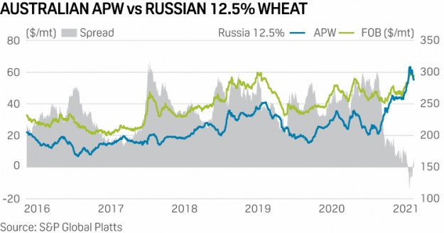 Australische tarwe is normaalgesproken tussen de $40 en $60 per ton duurder dan Russische tarwe. Omdat de Russische prijzen met dik 50% zijn gestegen sinds afgelopen oogst, en de Australische juist gedaald, is dat verschil nu nihil. Half februari staat de Russische tarweprijs op $282 FOB en die van Australië op $284 FOB. De transportkosten en het risico van handelen in Australië zijn de grootste nadelen.