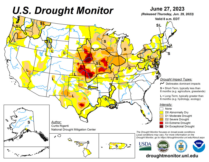 In de VS en voor het oosten van Canada wordt wel regen voorspeld de komende dagen. Als die neerslag daadwerkelijk valt in voldoende mate kan de maïs en soja daar veel profijt van hebben. Dat is overigens nog niet direct voldoende om de droogteproblemen direct op te lossen, zo blijkt uit de gisteren gepubliceerde droogtemonitor. Het probleem is zich wel aan het verplaatsen. Op de zuidelijke prairies zijn de roodgekleurde vlakken kleiner geworden, terwijl richting de midwest het kaartje steeds donkerder kleurt.