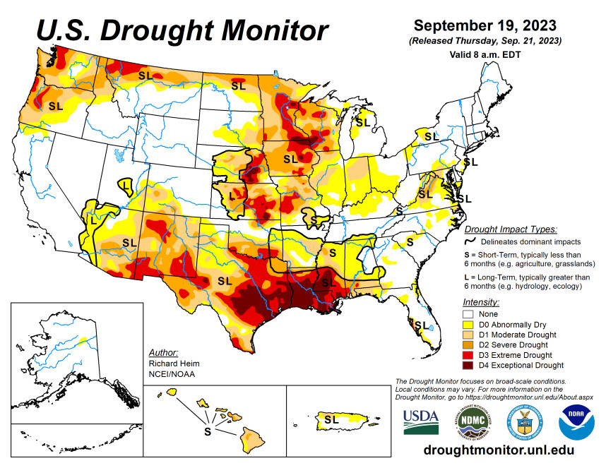 In de VS heeft de markt last van een sterke dollar en een wat zwakke export. Spelers op de granenmarkt bouwen daarom de risicopremie die in de graanprijzen verwerkt zit wat af. De weerberichten voor de VS worden door analisten op verschillende manieren uitgelegd op het moment. Neerslag wordt voorspeld de komende dagen voor de noordelijke prairies en het centrale deel van de Midwest. De oogst van maïs en soja loopt daardoor vertraging op, wat redelijkerwijs een wat prijsopdrijvend effect kan hebben. Aan de andere kant is het droog in de VS en groeit het gebied met een serieus neerslagtekort zo laat de gisteren gepubliceerde droogtemonitor zien. Zeker voor de wintertarwe die zo onderhand gezaaid wordt, is aanvulling van het vocht in de bodem meer dan welkom.