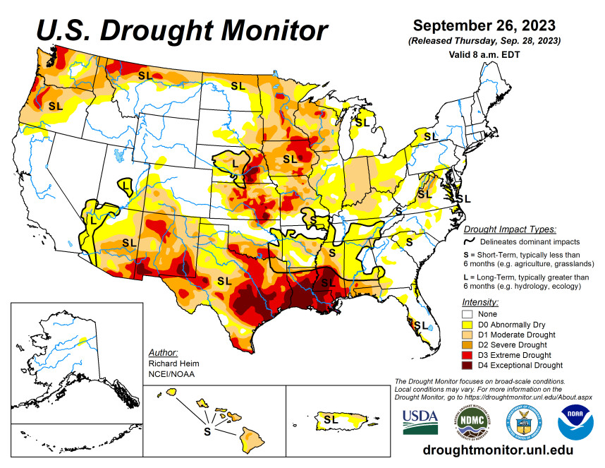 In de VS is de neerslag van afgelopen week op de noordelijk plains en in de cornbelt terug te zien op de droogtemonitor. De echte maïsstaten als Illinois en Iowa kleuren net iets minder rood op de kaart. In het zuiden is er echter weinig verandering en worden de rode vlekken eerder groter.